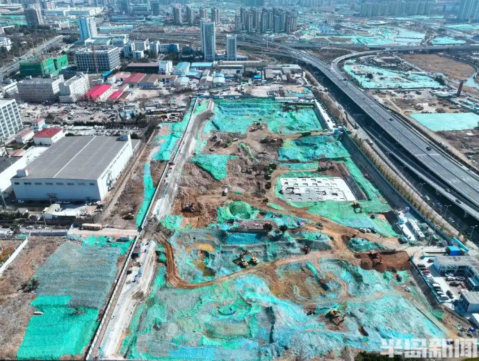 3月25日,在位于崂山区张村河片区的深圳路以东、长沙路以北,东韩地铁站东北侧地块,这里一派忙碌景象,施工车辆正在进行土石方作业,有些区域已经开始了地基部分的建设,这里将建成崂山区人民医院项目。